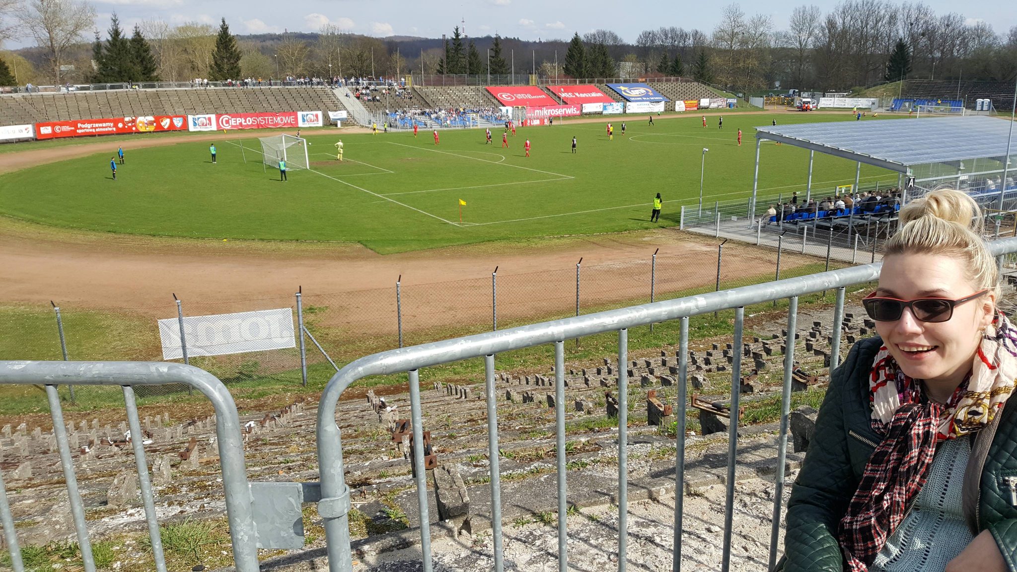 Po drodze mijałam nasze boisko piłkarskie. Nie przepadam za piłką nożną, ale docierające hałasy zza płotu świadczyły o trwającej imprezie. Dzięki uprzejmości organizatorów, zawitałam na stadionie dosłownie na chwilę. Odbywał się drugoligowy mecz z udziałem naszej drużyny. Niestety nie mogłam skupić się na trwającym turnieju, widząc w jak opłakanym stanie jest aktualnie stadion. Druga liga piłkarska zobowiązuje do meczy z drużynami z całej Polski, skoro tak to mnie jest wstyd, że przyjmujemy gości w takich warunkach. Mimo wszystko życzę zespołowi Gwardii Koszalin sukcesów.