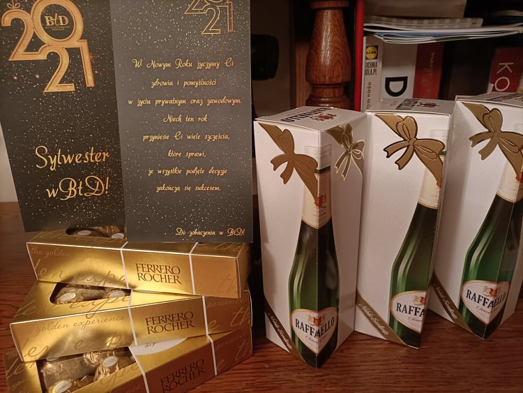 Tradycją tych naszych noworocznych teatralnych spotkań, jest składanie sobie wspólnych życzeń przy lampce szampana. W tym roku, z powodu pandemii zadziało się inaczej. Przy wyjściu dla każdego widza czekała milutka niespodzianka. Osobista mała butelka szampana oraz słodkości.